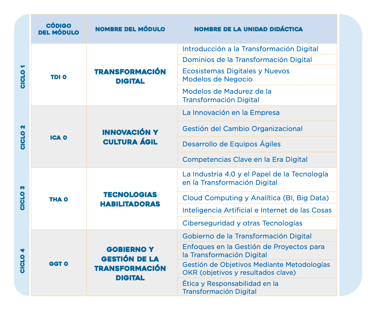Formar líderes capaces de afrontar los desafíos del entorno empresarial actual, que se caracteriza por ser volátil, incierto, complejo y ambiguo (VUCA). El programa prepara a los profesionales para dominar las tecnologías disruptivas y la gestión estratégica. De esta manera, podrán diseñar y ejecutar proyectos de transformación digital que aseguren la sostenibilidad y competitividad de las organizaciones.