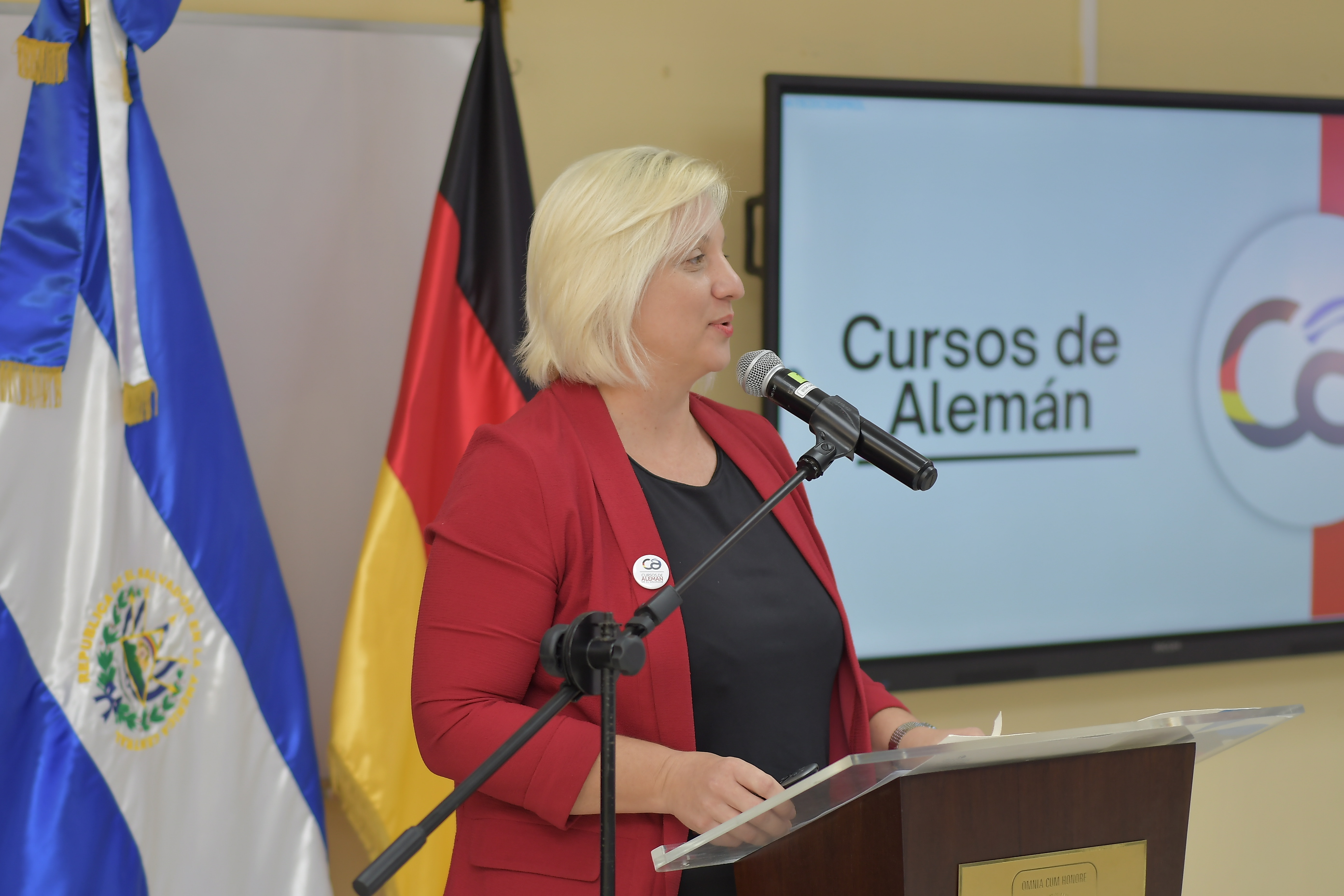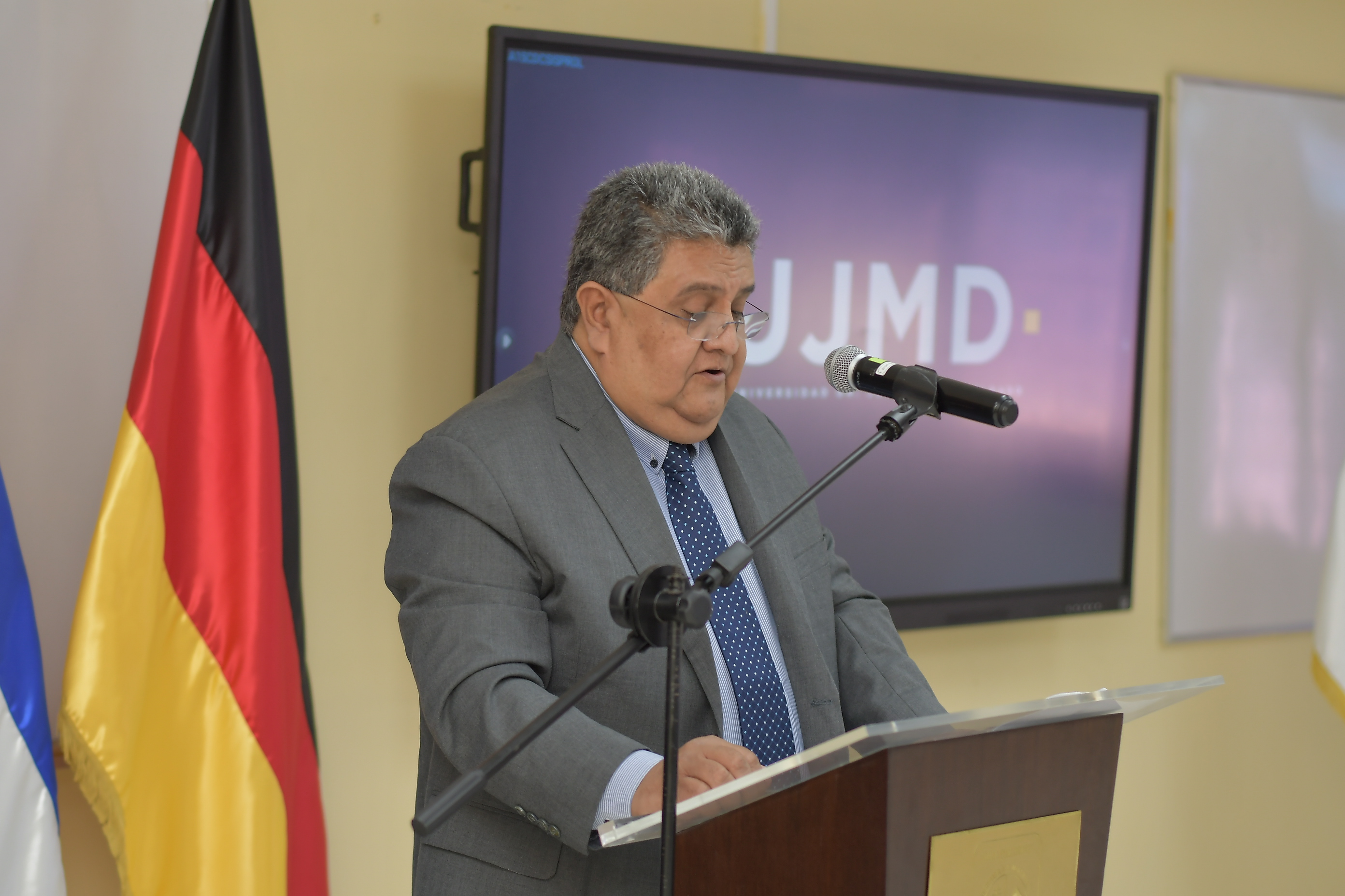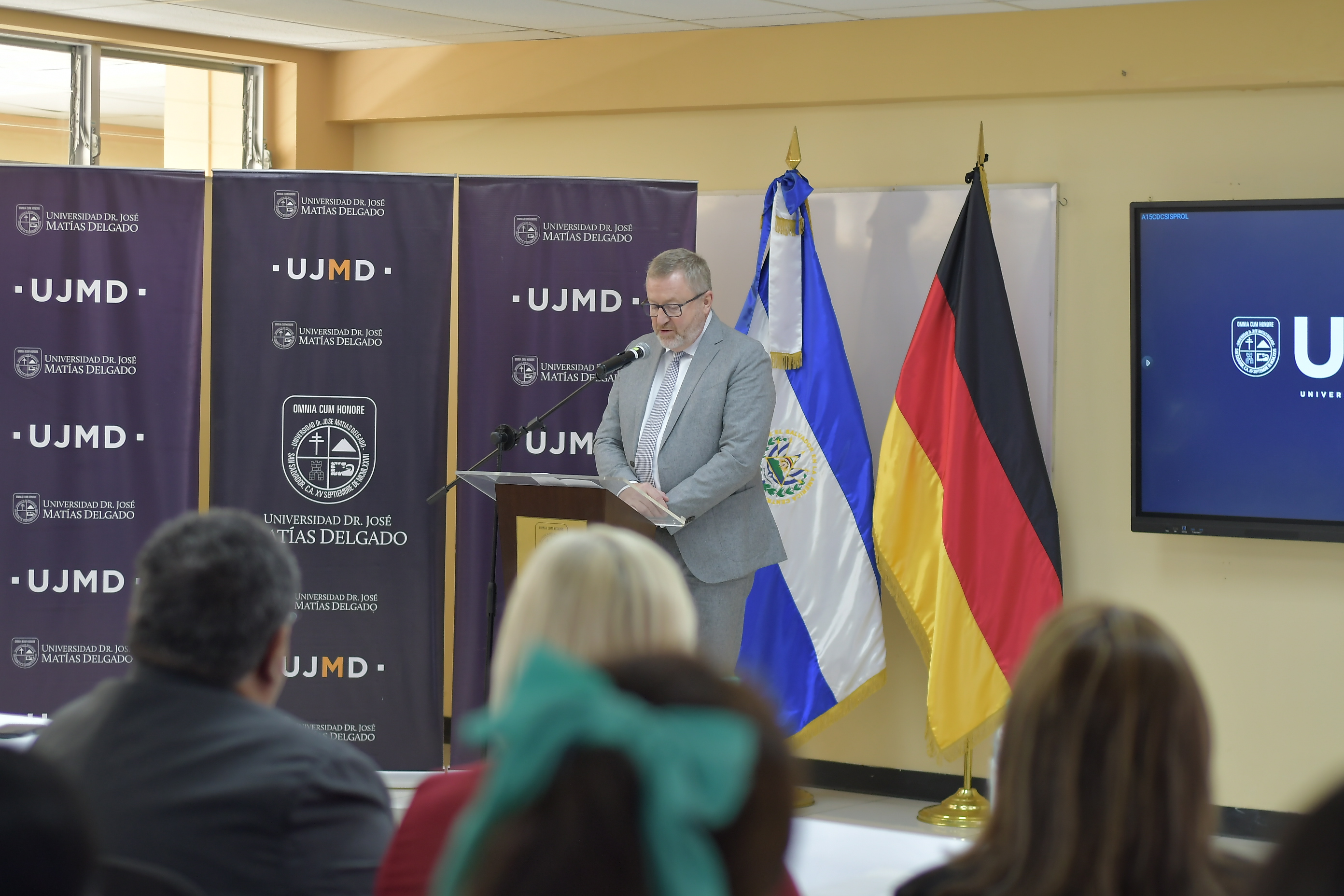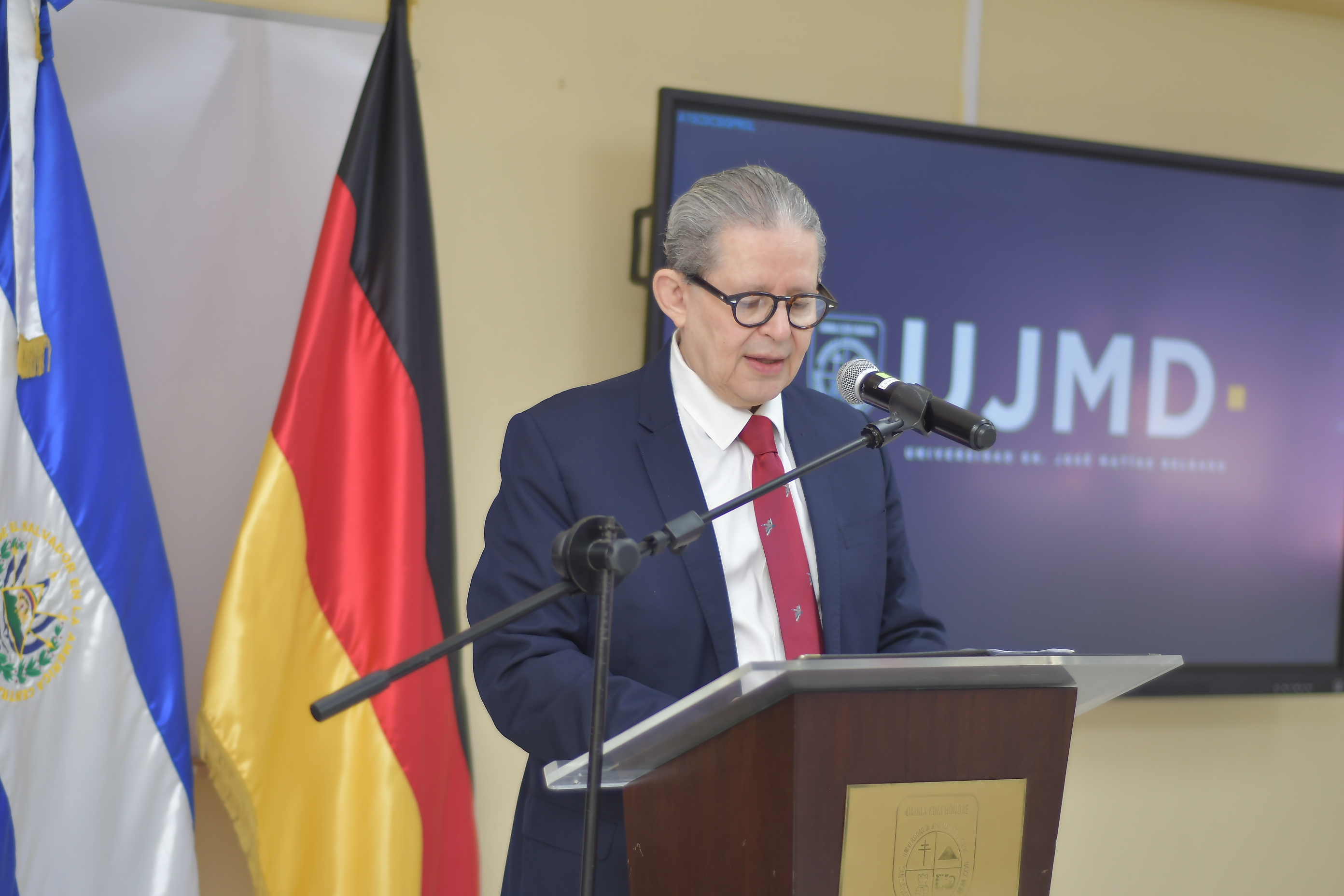El acto oficial se llevó a cabo, con las palabras de bienvenida del Dr. Enrique Sorto Campbell, rector de la UJMD, y del Excelentísimo Señor Embajador de la República Federal de Alemania en El Salvador, Friedo Sielemann.